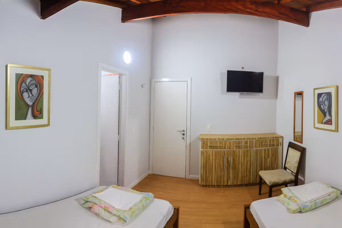 Desfrute de uma estadia acolhedora em nossa suíte, ideal para quem viaja em dupla e valoriza conforto e praticidade. O ambiente é equipado com duas camas de solteiro, ar-condicionado, TV de 32 polegadas e banheiro exclusivo para o seu bem-estar.