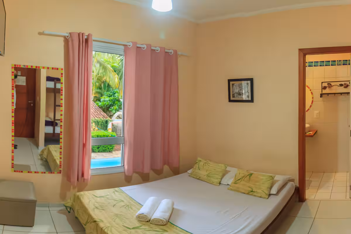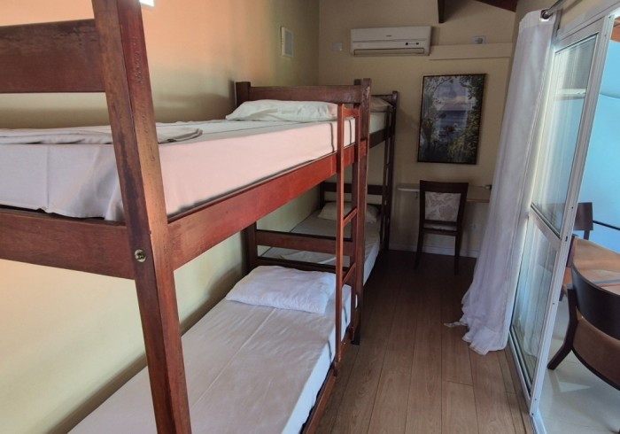 Desfrute de uma estadia acolhedora em nossa suíte família no andar superior, ideal para famílias ou grupos maiores que buscam o máximo de conforto e momentos inesquecíveis. O ambiente é equipado com uma cama de casal, dois beliches, armário, ar-condicionado, TV de 32 polegadas, banheiro exclusivo e uma charmosa varanda privativa com rede e vista para a piscina para o seu bem-estar.
